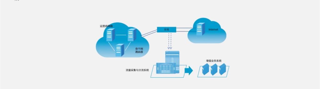 基于电信骨干网以及城域网的构建方式,目前开展增值业务主要以旁路方式为主,不影响骨干节点的可靠性,避免新设备或者业务的引入降低骨干网的可靠运行。通过分光器等手段将汇聚节点或者出口节点的流量复制到前端分流设备,通过分流设备提取其中的数据包,进行分析处理,同时提供数据的分类和过滤,适应不同的业务。